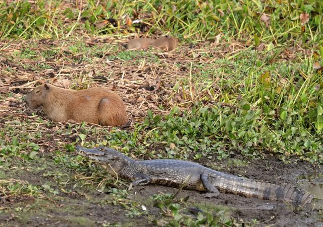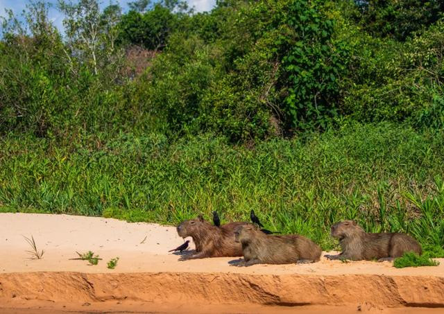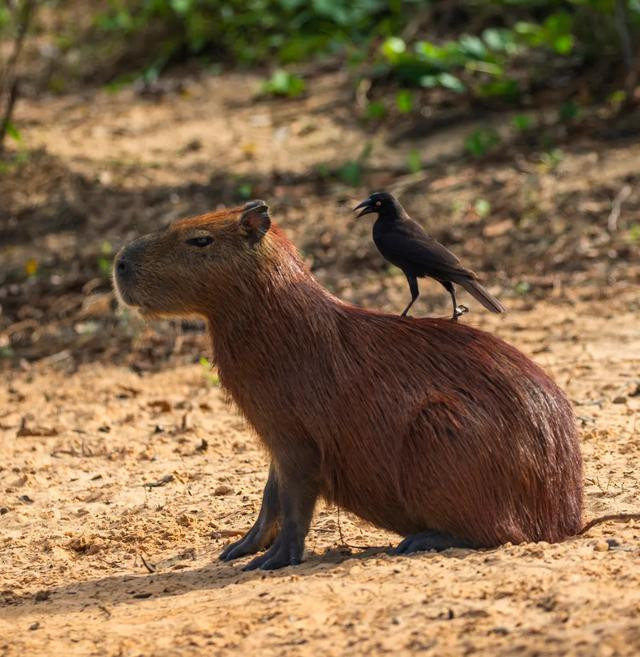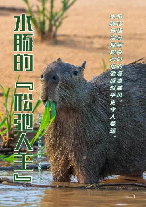 水豚虽然是个大块头,但性格温和,攻击性不强,就算被鸟类站在头顶或被猴子趴在身上,它也是一副“见怪不怪”的模样。此外,水豚能够为其他动物带来好处,比如它们身上的寄生虫可以成为巨牛鹂和牛霸鹟(wēng)等鸟类的美食,发现危险时的叫喊声可以为一些动物提供预警,因而水豚成了动物界的“社交达人”,与很多动物建立起和谐相处的关系。它有时和鸟类一起发呆,有时和龟类一起泡澡,一些成年水豚甚至能和鳄鱼一起晒太阳。这样的“松弛人生”,谁能不羡慕呢?