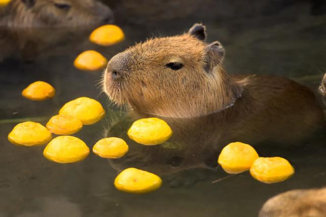 作为半水生动物,水豚喜欢在水里做各种事情,比如乘凉、求偶,或者呼呼大睡(睡觉时鼻孔露出水面)。而人们最熟悉的,大概就是水豚泡温泉的可爱画面。“水豚+温泉”的组合源自日本。水豚从高温高湿的南美洲来到日本后,有时会因气候差异出现皮肤干燥的情况,而泡温泉能保养水豚的皮肤。人们还发现,水豚泡温泉时眼睛眯得越小、耳朵越靠后,说明泡得越舒适。