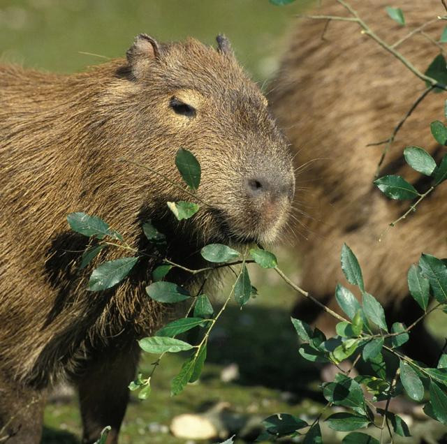 ↓水豚外出觅食时会在路边植物上留下气味腺分泌物,从而防止迷路
