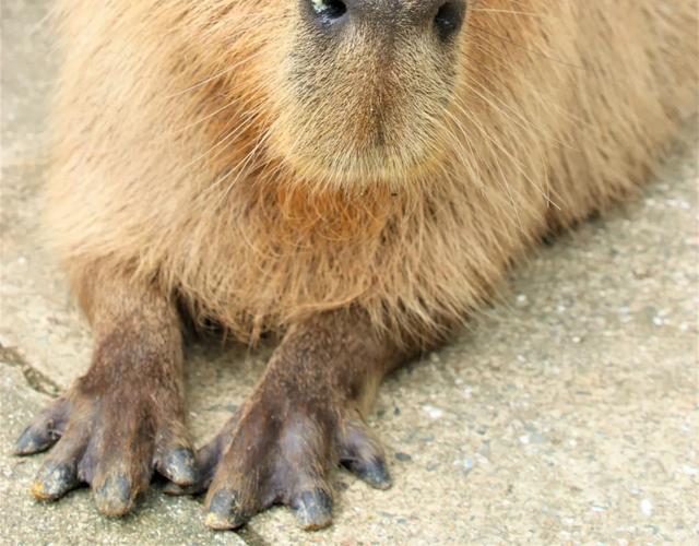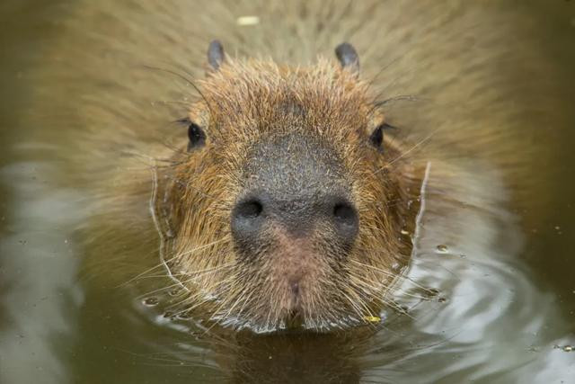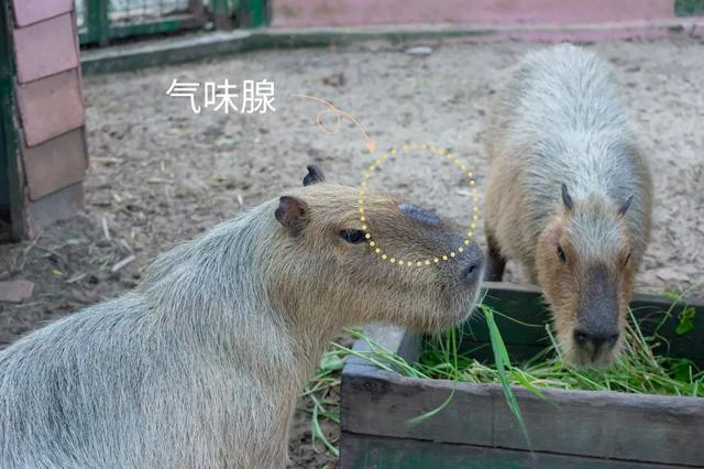 其实,水豚主要通过声音和气味与同伴沟通。它们的视力不算发达,但听觉和嗅觉都很灵敏,在日常交流时可以通过叫声传达情绪和提醒同伴注意危险,也可以通过气味腺(位于水豚的鼻子和肛门附近)分泌的带有特殊气味的液体来寻找同伴及表达求偶意愿。水豚鼻子上的气味腺同时也是人们区分雌雄水豚的线索。